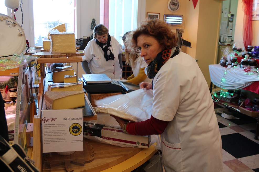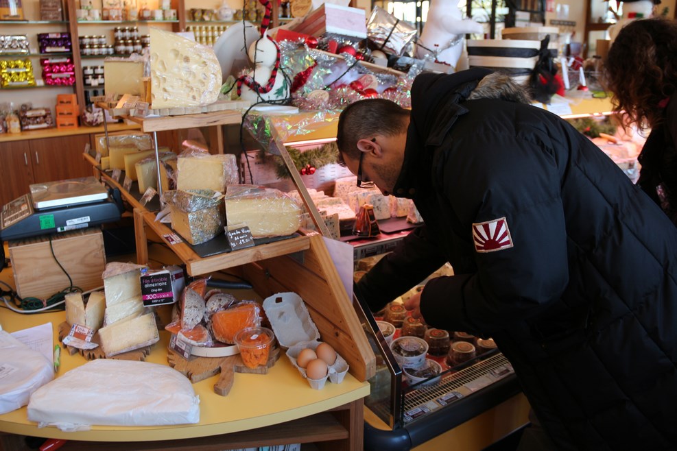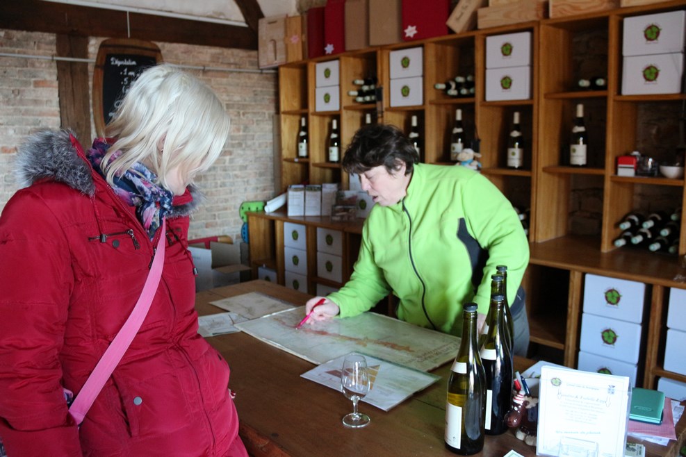 Зашли в один из магазинов, где продают вино, продавщица объясняет нам на французском языке, как добраться до сыроварни: