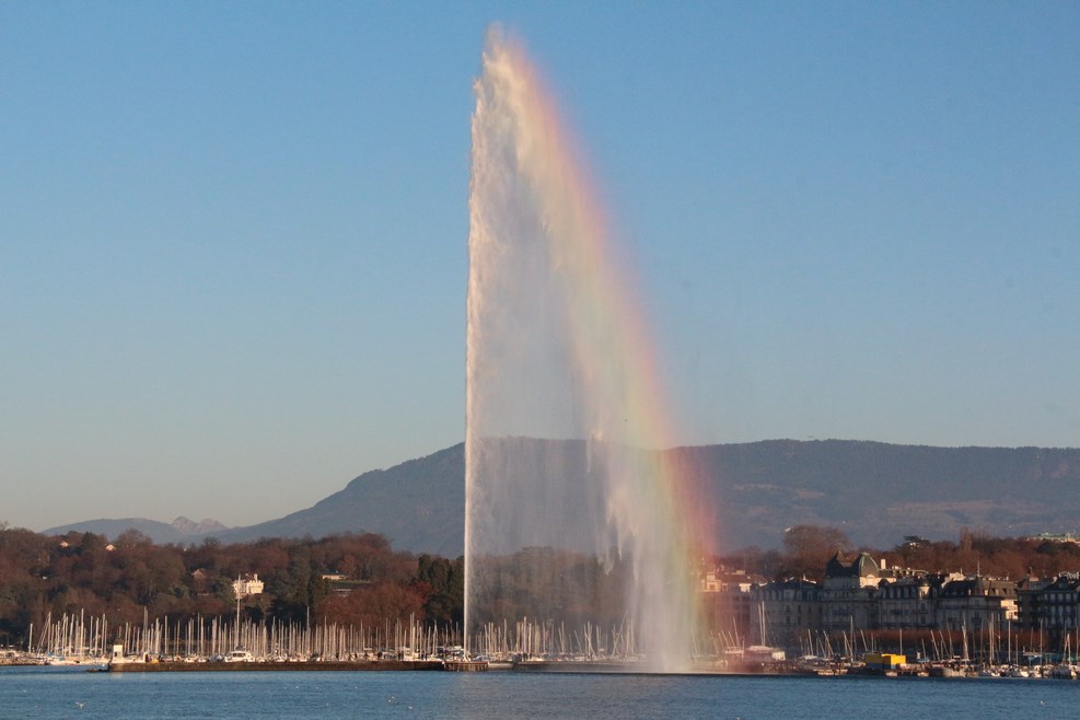 От бьющего вверх фонтана с некоторых ракурсов видна красивая радуга: