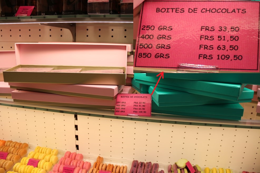 Перед отъездом зашли купить швейцарского шоколада. Граммы слева, цены справа (1 франк = 1 доллар):
