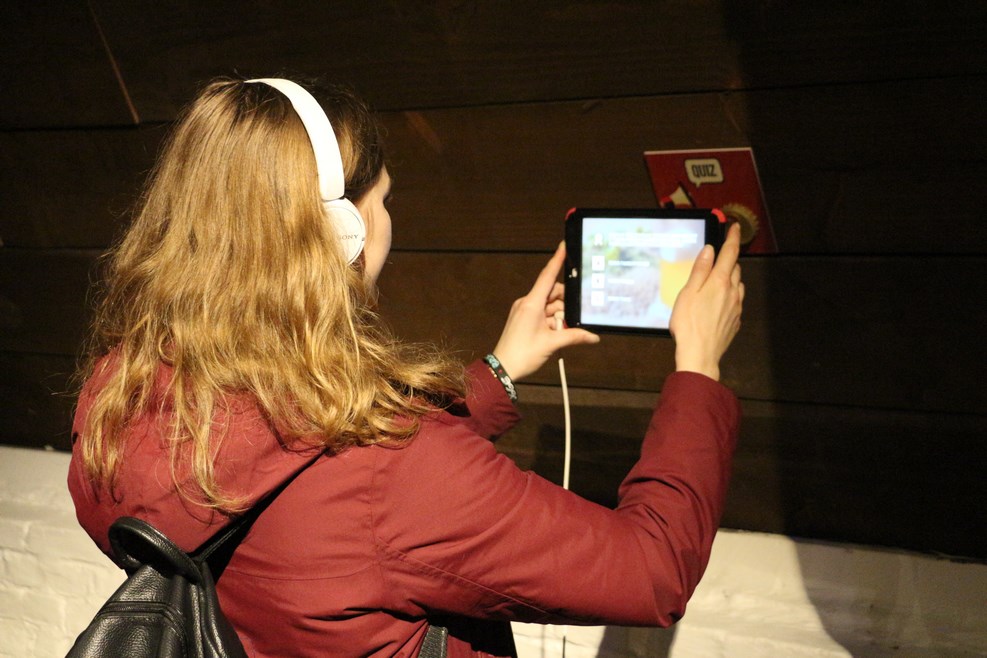 Планшет наводится на метку и в наушниках мы слушаем интересные рассказы о пиве: