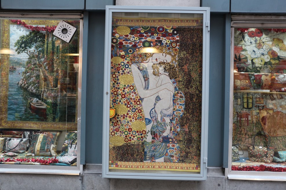 Уличная выставка гобеленов. Посередине без труда узнается картина Густава Климта: