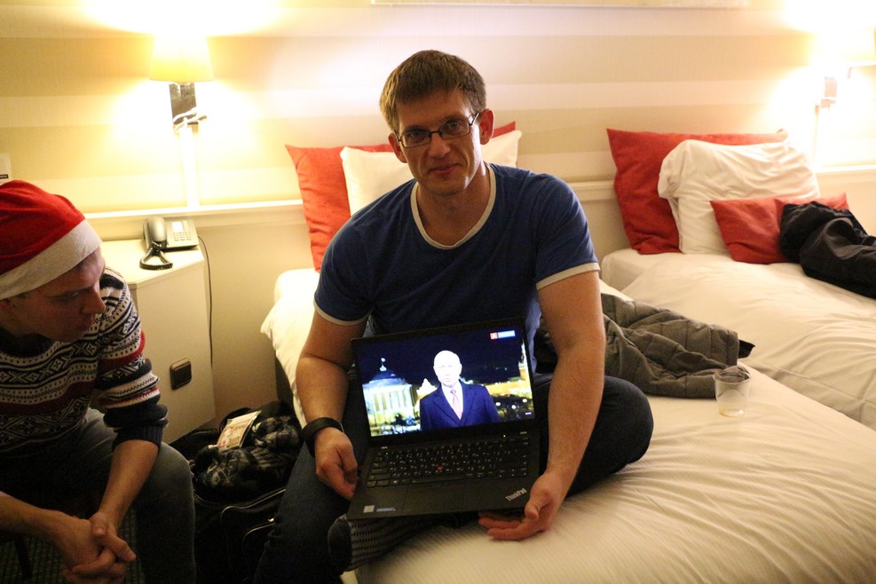 Какой же Новый Год без Путина. Леша трепетно держит ноутбук с вождем: