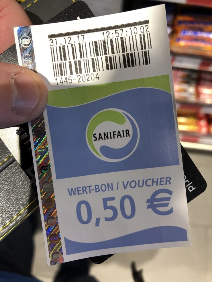 Туалет в Германии на заправках платный. Стоит 70 евроцентов. Правда на входе при оплате автомат выдает такой талон, и при покупке еды в магазине при заправке можно получить скидку в половину евро: