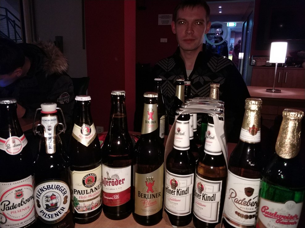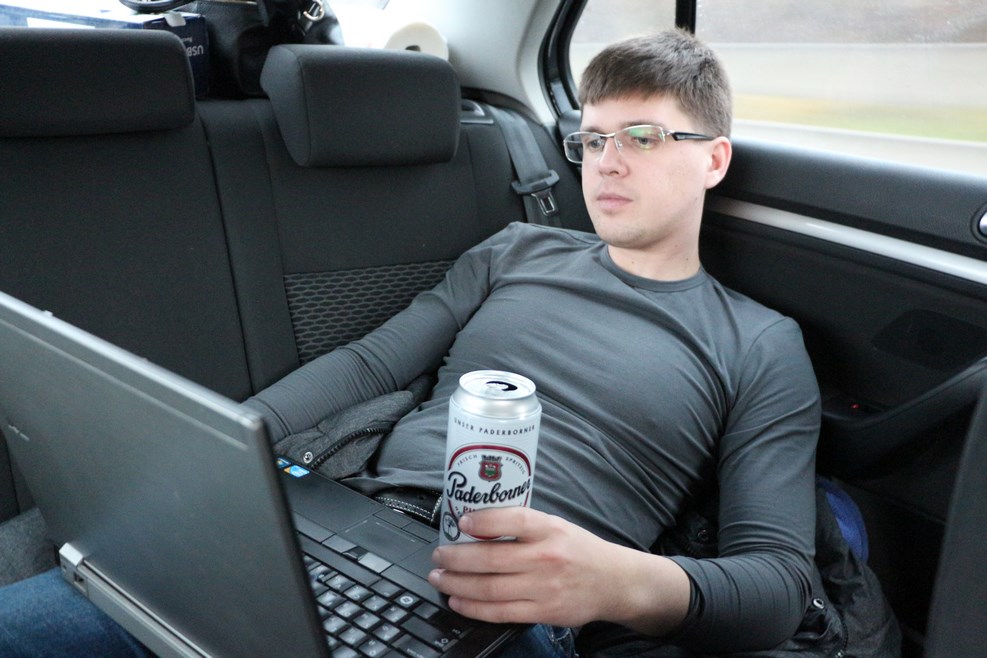 Юрка умудрился за вчерашний день поездить за рулем сразу на двух машинах, а сейчас у него заслуженный отдых с немецким пивасом: