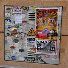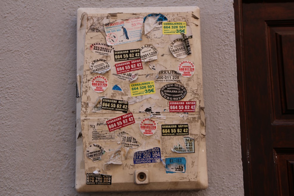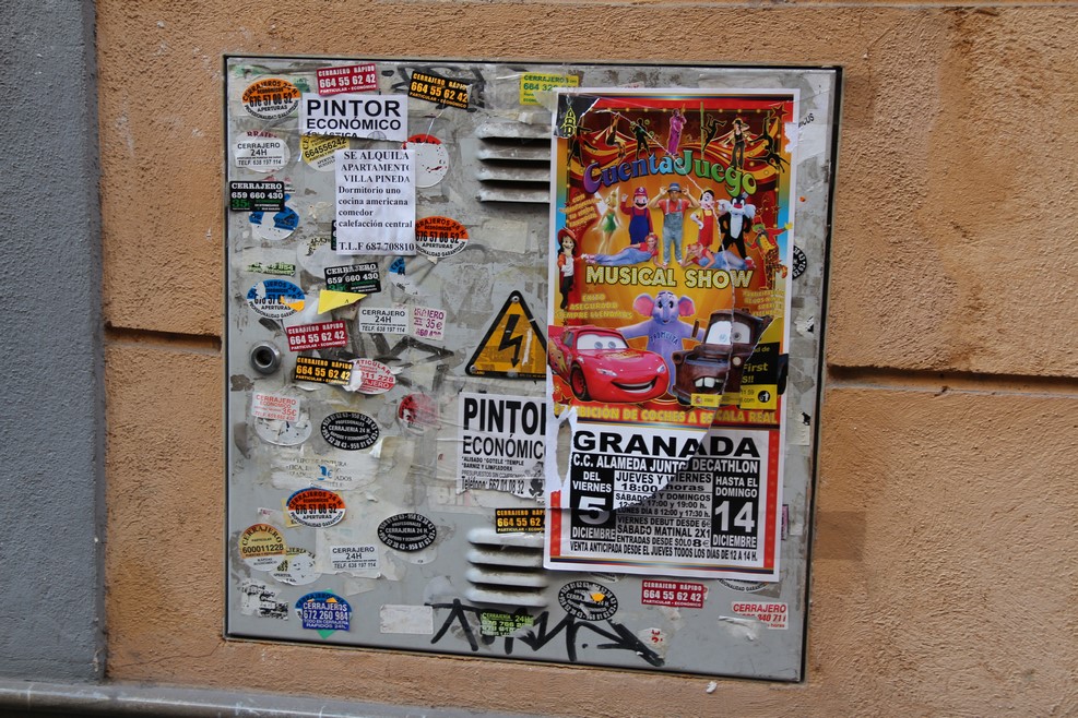 Уличные объявления у испанцев совсем маленькие, ими заклеены все железные поверхности: