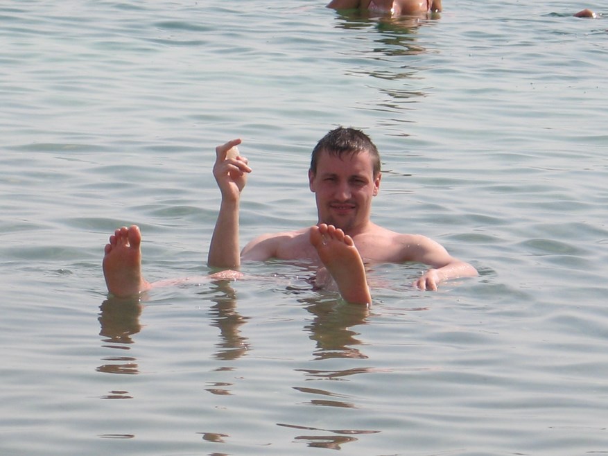 Вода мертвого моря настолько соленая, что спокойно держит вес человека. Я лежу прямо на поверхности воды с куском соли, который только что достал из под ног: