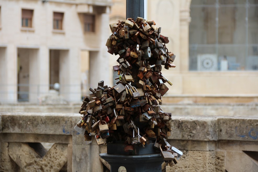 Вездесущая традиция вешать замочки. Тут вешают на фонарный столб, а не на мост как обычно (щелкните по фото, чтобы приблизить):