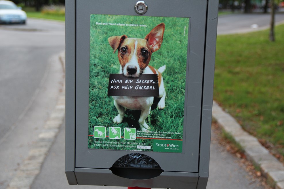 В прогулочной части — надпись на ящике гласит «Возьми пакет в кармашек, ты для моих какашек»:
