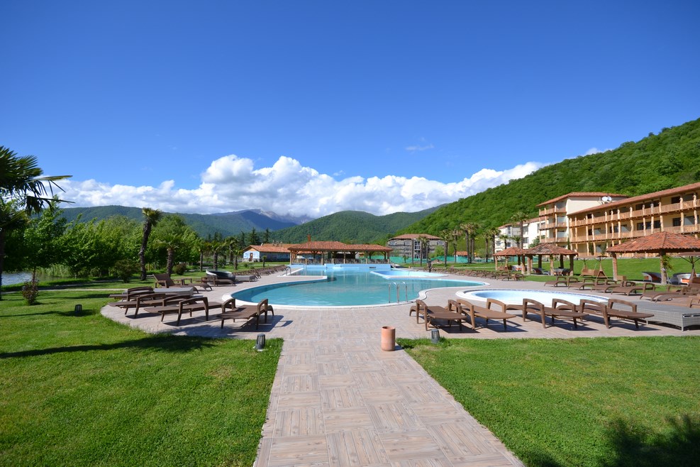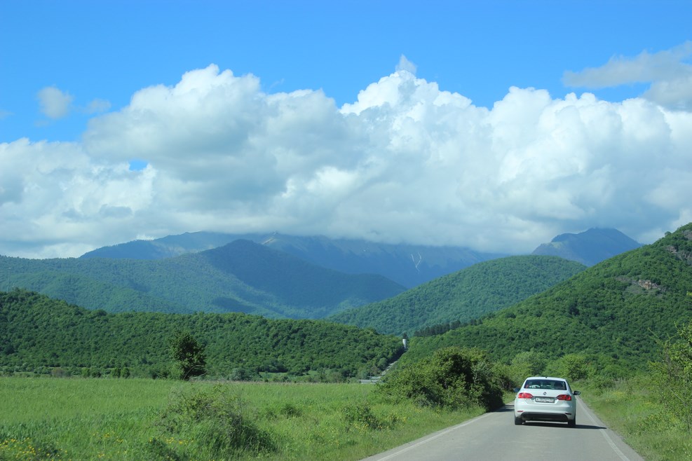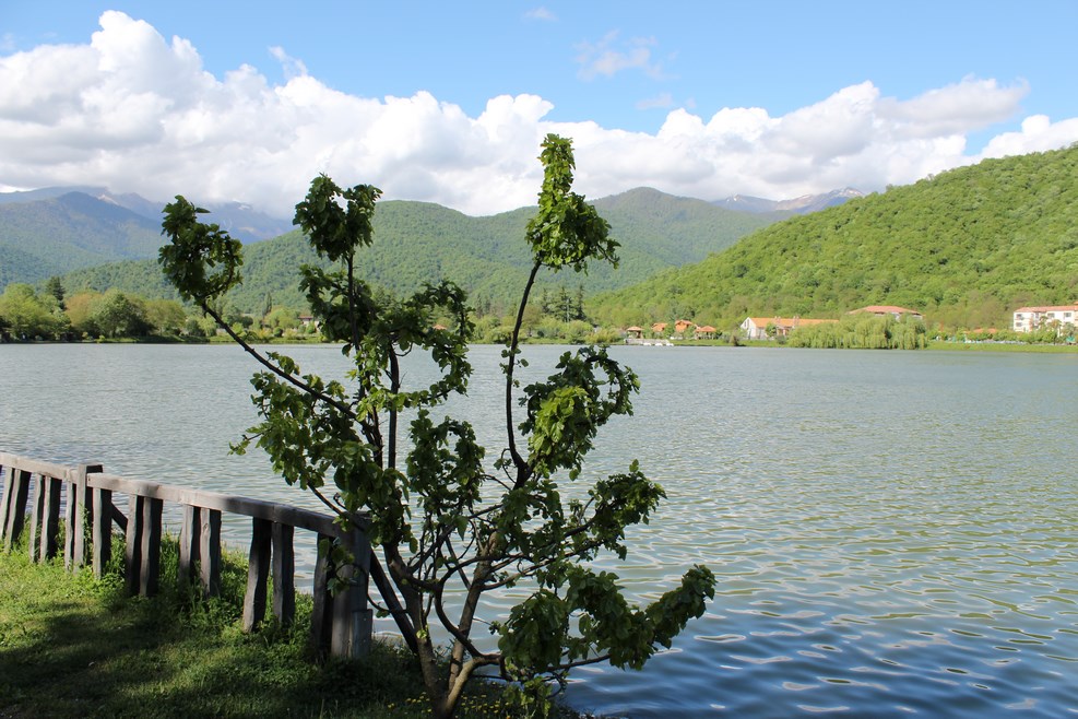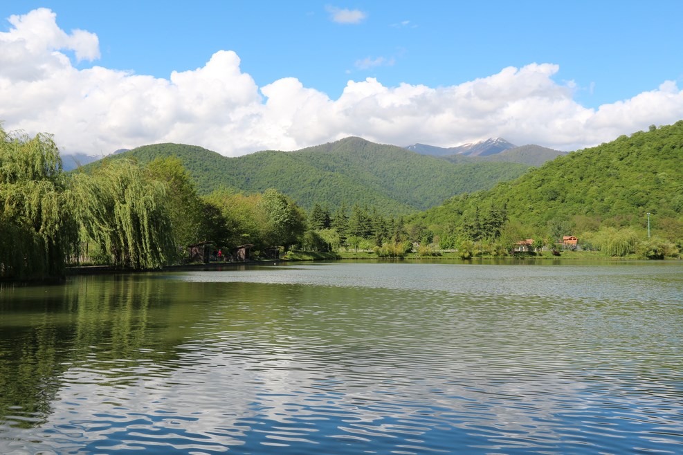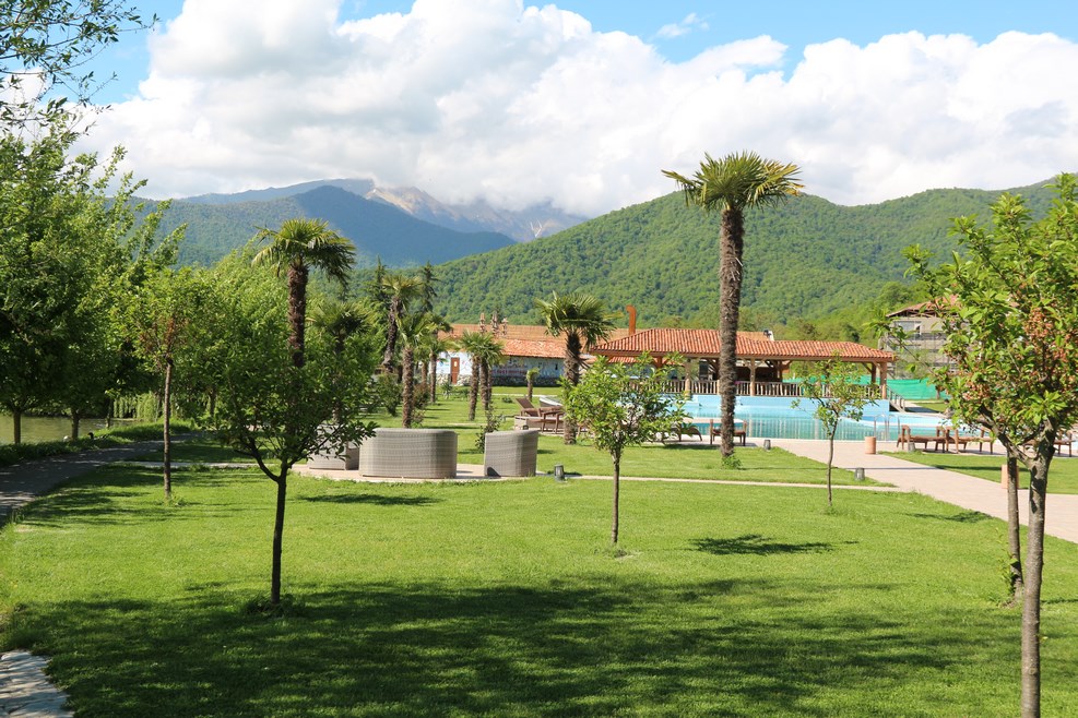 Неподалеку нас остановил охранник. К озеру просто так не проедешь, потому что вокруг озера расположен гостиничный комплекс, и по существу озеро могут посмотреть только посетители отеля. Благодаря кавказскому гостеприимству нас все-таки пропустили в виде исключения. К самому озеру ведет небольшая узкая асфальтная дорожка: