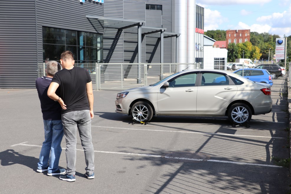 Около автосалона мужики примеряют диски к авто: