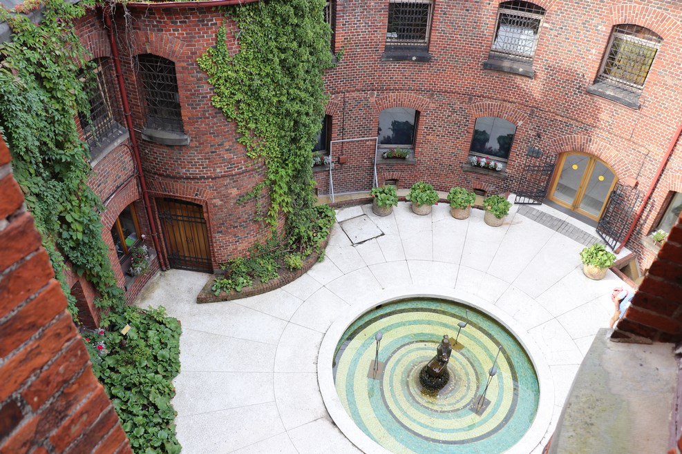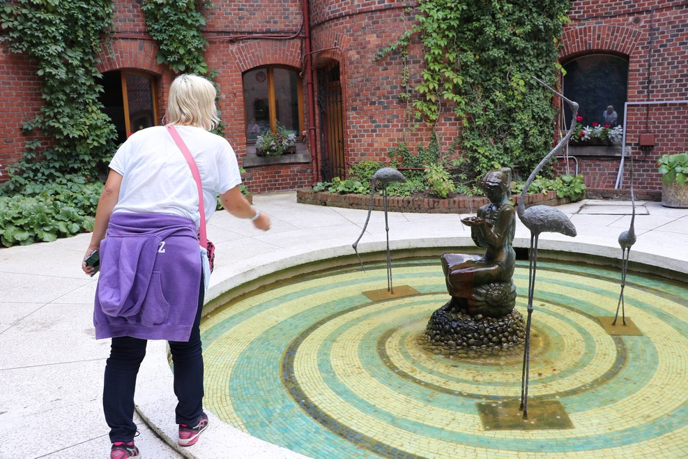 Внутренний двор музея. В середине стоит фонтан с девой: