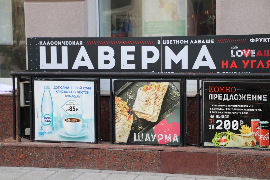 В Нижнем Новгороде еще не определились шаверма у них или шаурма. На вывеске написали и так, и так: