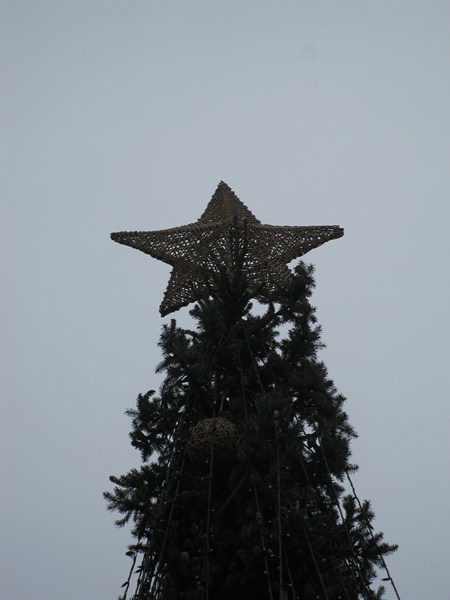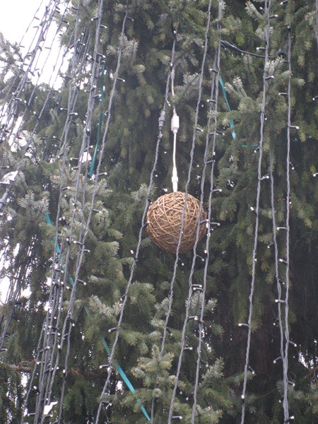На центральной площади стоит елка. На ней, почему то, звезда и украшения выполнены из дерева: