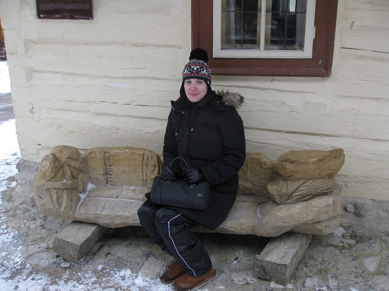 Олька на резной лавочке: