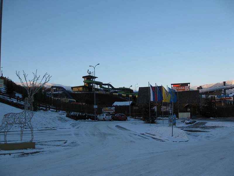 Стоимость входного билета составила 17 евро, и еще 16 евро за сауну. «Татраландия» это огромный летний спа, зимой гостям доступны только 2 горки, 3 закрытых и один открытый бассейн. В сауну ходили только наши девочки, и она им очень понравилась. Около входа: