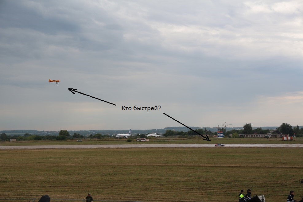 На аэродроме выясняли отношения машины и самолеты. Быстрейшего выявлял дрэг-рейсинг. Самолет и машина стартовали одновременно: