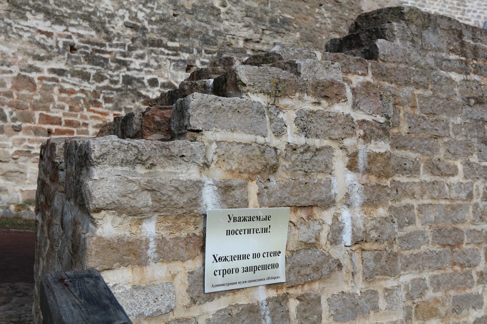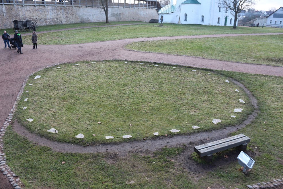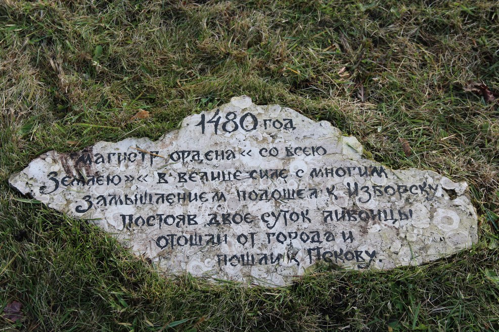 Классное изобретение, которое я увидел в первый раз. Посетители идут по кругу вдоль табличек, на которых написаны исторические события, произошедшие с Изборском в разные времена: