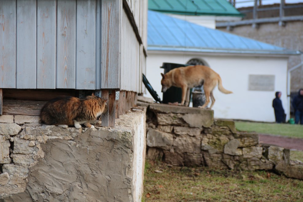 Кот ждет из засады, когда собака свалит подальше: