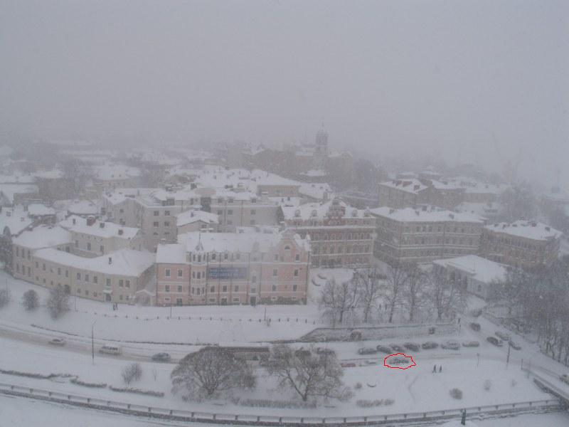 Выборг встретил нас обильным снегопадом. На фотографии в кружочке стоит джетта, оставленная 10 минут назад, но уже заваленная снегом до неузнаваемости:
