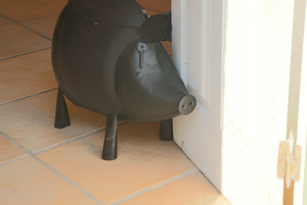 Свинья держит дверь магазина: