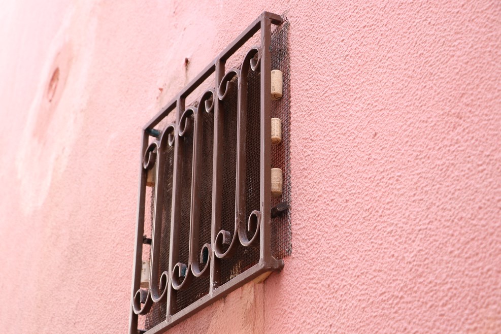 Сетку к стене прикрепили винными пробками:
