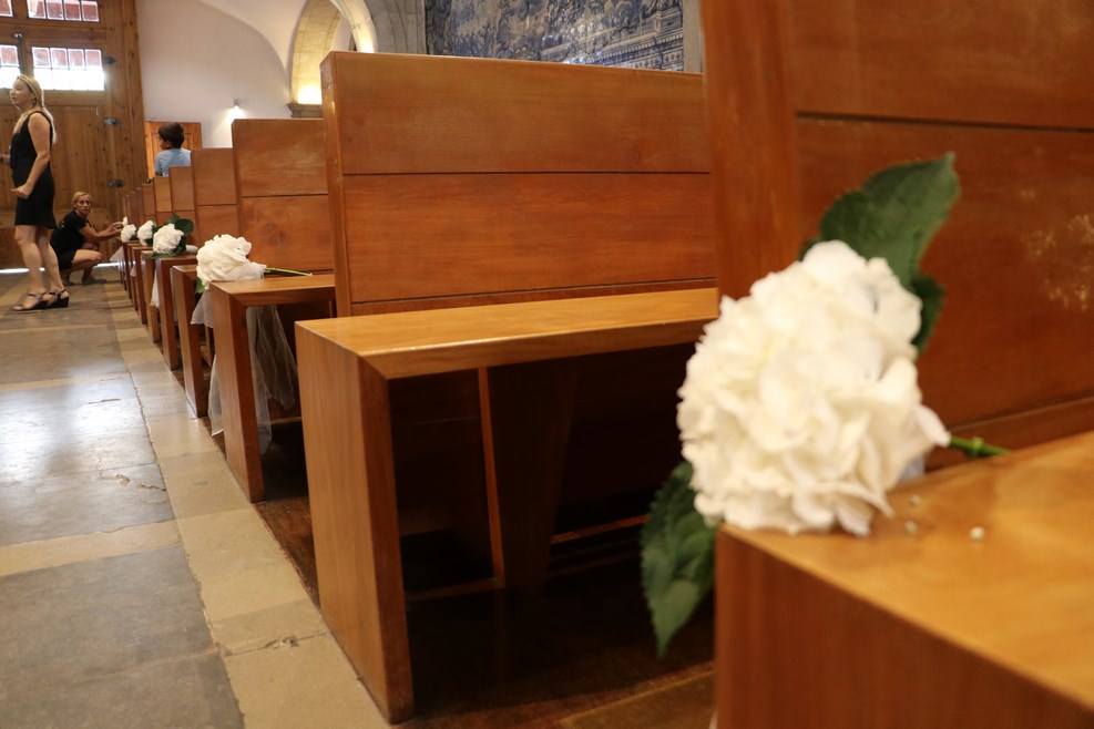 Внутри церкви перед церемонией на каждую лавочку положили по букету: