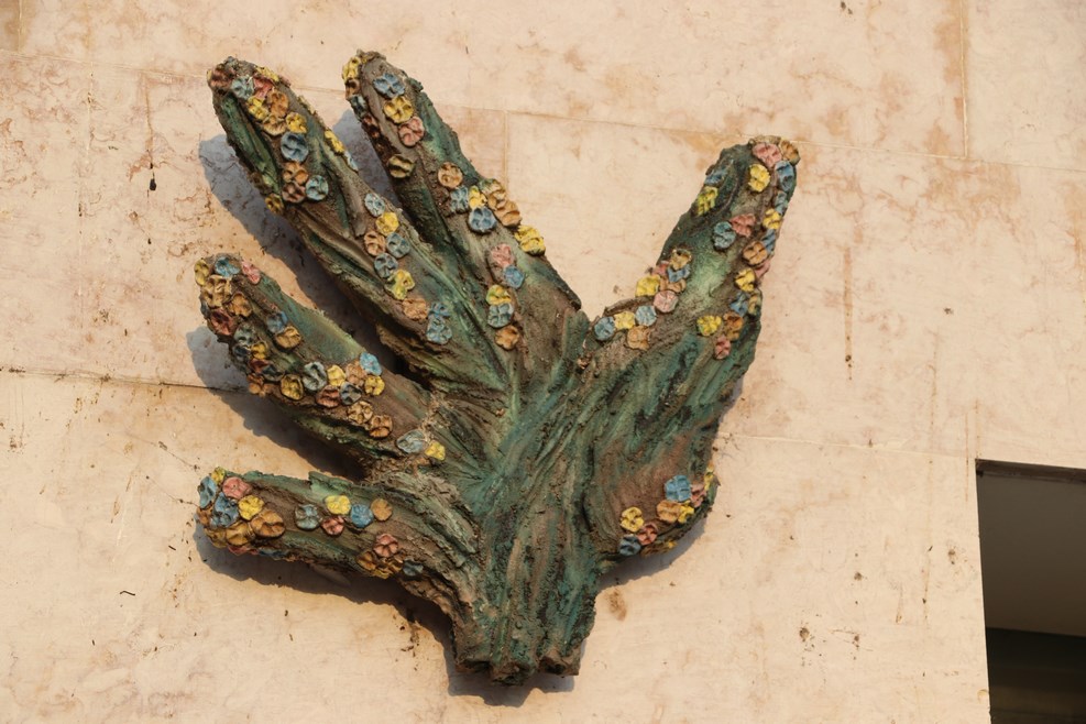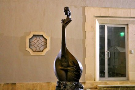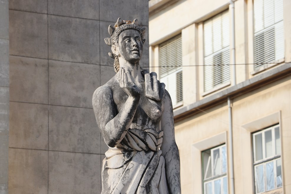 Перед входом расположены скульптуры, наверное, студентов. Все они, по непонятной причине, обнажены до торса: