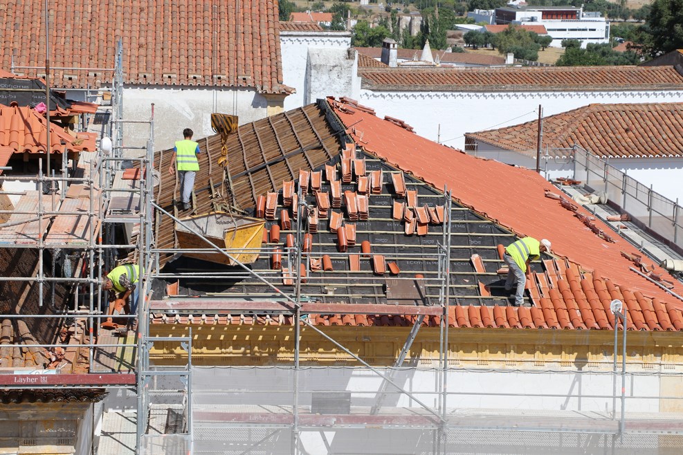 Можно даже увидеть, как строители кладут черепицу на крышу: