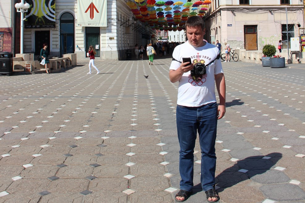 Это позволяло снимать «скрытой камерой», ведь я делал съемку не беря аппарат в руки. Так я снял фотографа, который снял меня на фото выше: