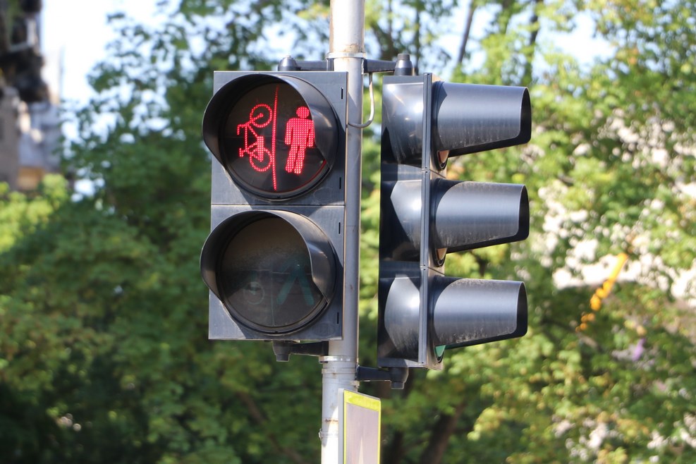 Сигнал пешеходного светофора. Вместе с кривоватым пешеходом обозначен еще и велосипед: