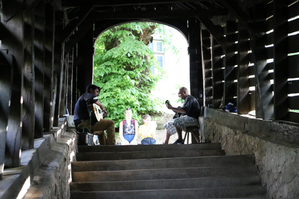 Теперь по деревянной крытой лестнице поднимемся наверх к замку:
