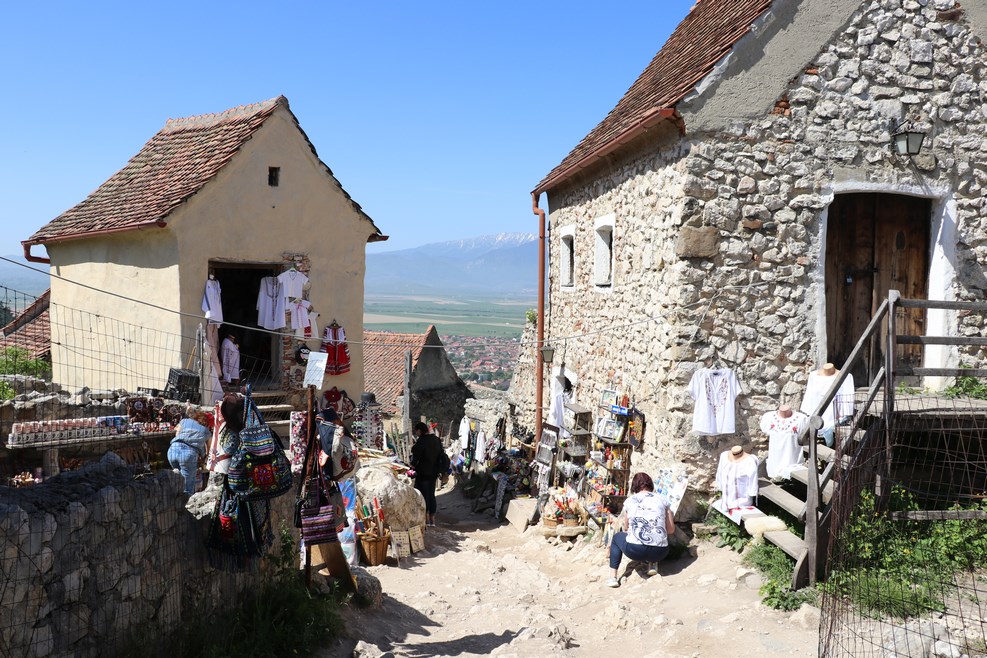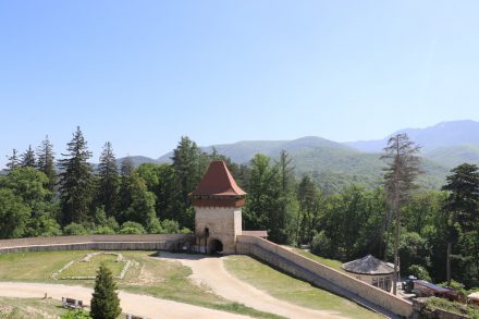 Крепость находится на горе. Посетителей туда с парковки поднимает и возвращает обратно за небольшую плату трактор с вагончиками: