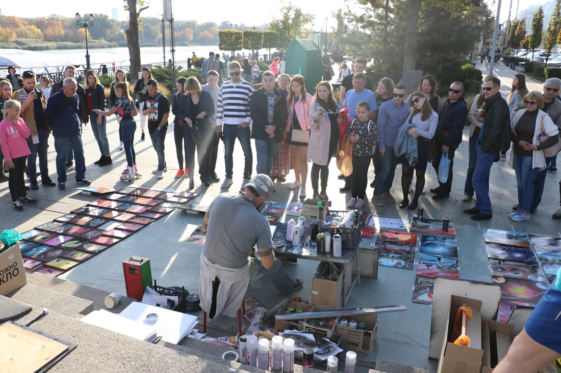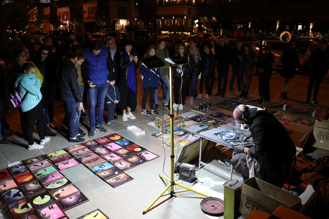 Обратно на берег мы вернулись уже затемно, но жизнь в городе вечером ничуть не угасает. Посмотрите, сколько народу стоит около художника: