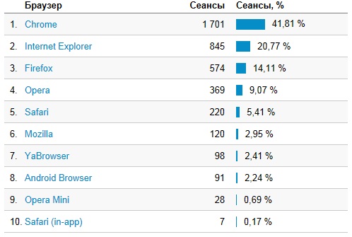 Распределение по браузерам, с большим отрывом лидирует Chrome: