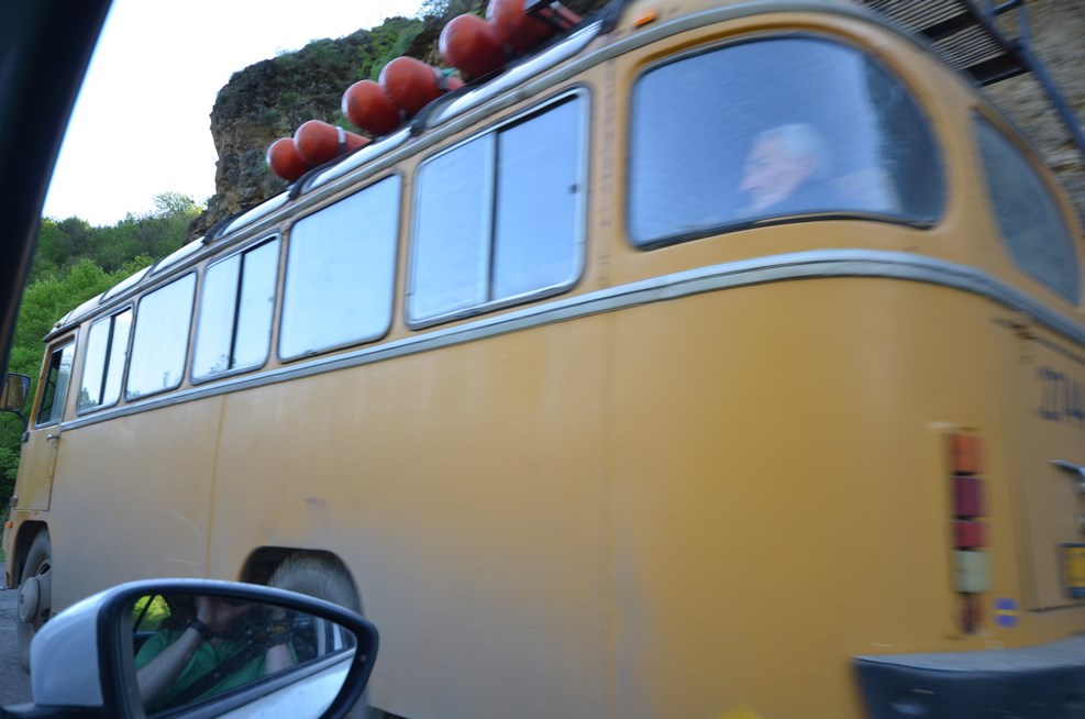 Выезжая из города, мы заметили маршрутный автобус. Это был старинный ПАЗик, работающий на газовом оборудовании. Вообще на газу тут ездит очень большое количество транспорта: