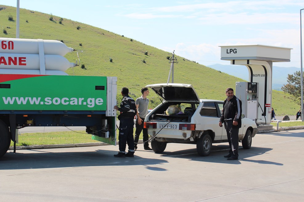 Перед границей встали на заправку, потому что в Грузии бензин дешевле. Это последняя заправка на трассе, где нам удалось заправиться, рассчитавшись картой. В Армении расплатиться можно было только наличкой: