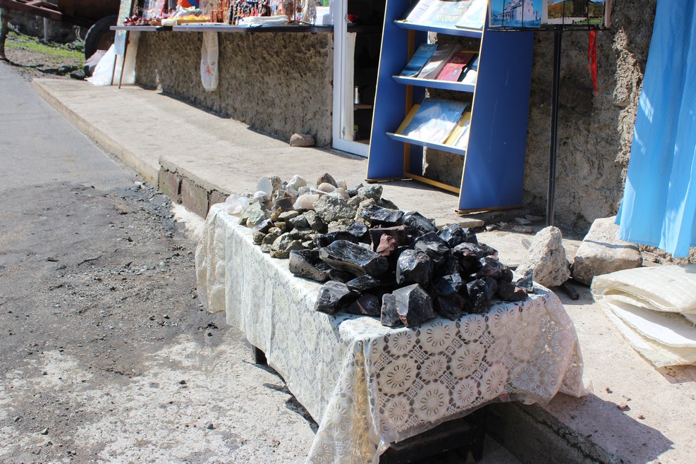 Продавцы перед храмовым комплексом торгуют кусками железной руды: