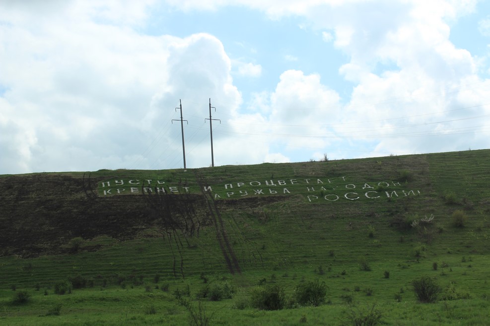 На узком участке перед КПП разъезжались легковушки и грузовики. Протиснувшись кое как в миллиметрах от закрывающих дорогу машин (тут первый раз вспомнилось про молитвы), мы проехали по довольно большому участку нейтральной полосы. Надпись на горе «Киев – Донецк — Мир»: