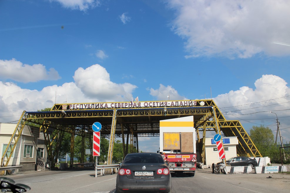 Через 40 километров от Владикавказа мы были уже на границе. По традиции объезжаем огромную очередь из грузовиков: