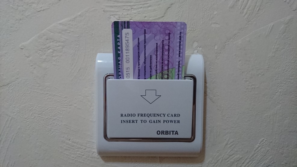 Маленький лайфхак. Если Вам надо выйти из гостиницы, а контактный ключ не позволяет Вам оставить электричество в номере, то воспользуйтесь любой карточкой подходящей по формату: