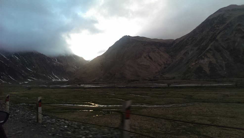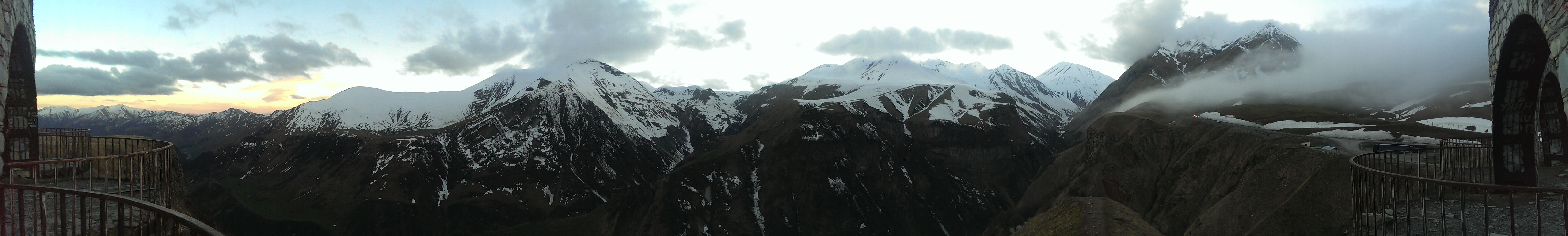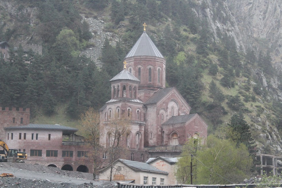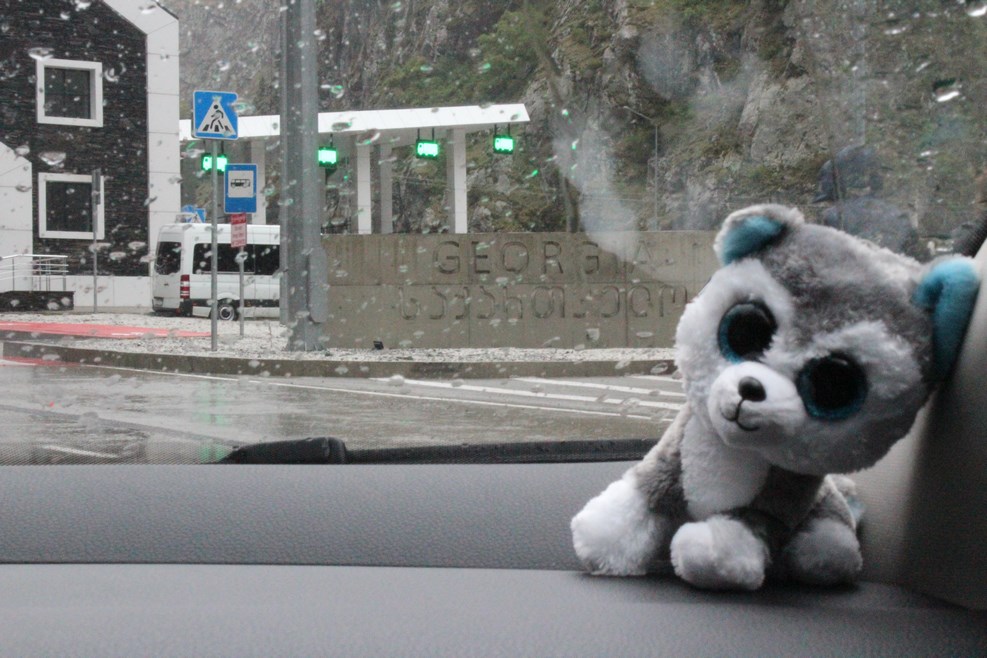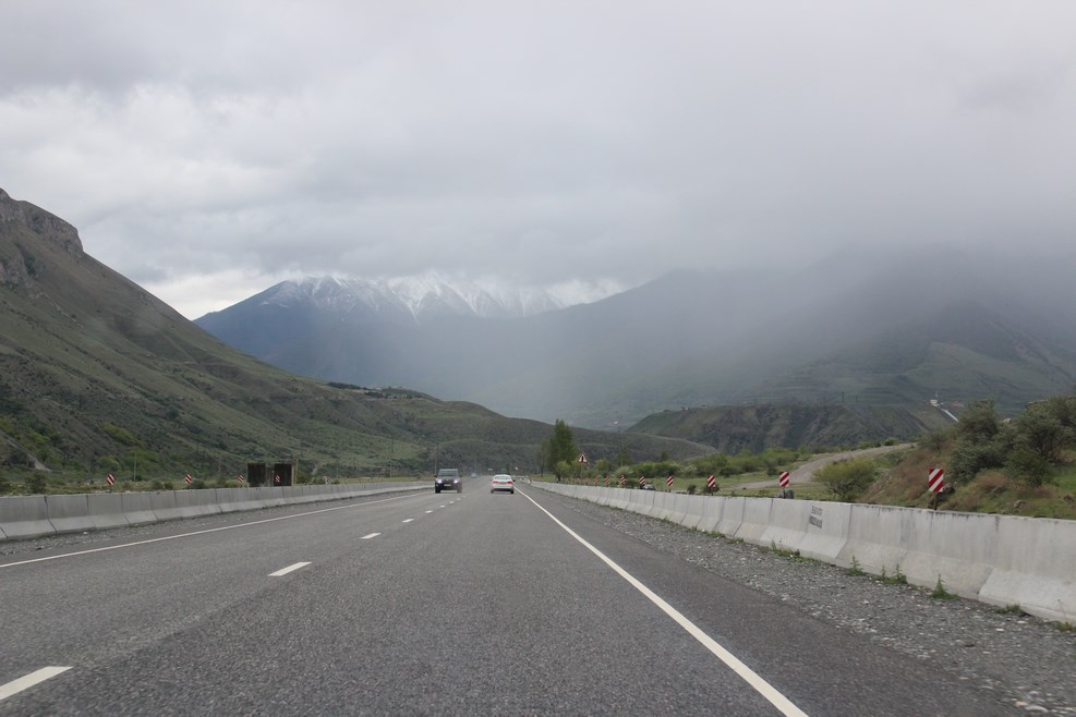 На грузинской части Военно-Грузинской дороги остался в плохом состоянии только один участок (в прошлом году их было два), остальные участки в хорошем состоянии. Подъезжаем к смотровой площадке «Арка Дружбы Народов» на Крестовом перевале (самая высокая точка дороги):