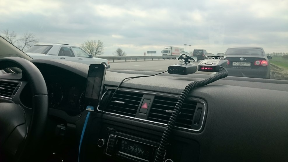 Флаг кстати потом этот экипаж потерял, и он так и остался валяться на дороге. Провели тест-драйв двух радар-детекторов (слева Stinger, справа Beltronics). Beltronics оказался более чувствительным, однако новейший радар «Стрелка» он ловил несоизмеримо хуже, чем радар-детектор от фирмы Stinger:
