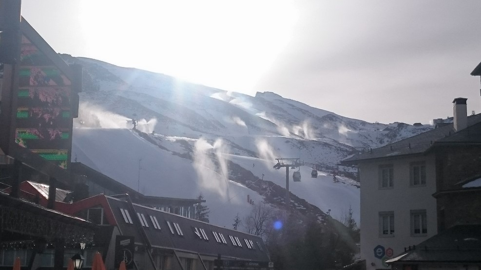 Это самый южный горнолыжный курорт Европы. Помните, я рассказывал, что в Сочи нам покататься не удалось из-за отсутствия снега на склонах. Так вот, мы умудрились покататься там, где зимы вообще не бывает. Работа снеговых пушек:
