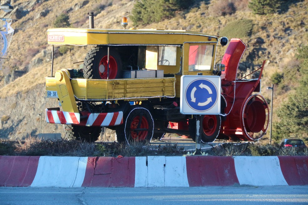 Около въезда к подъемникам старая снегоуборочная машина и старые кабинки подъемников:
