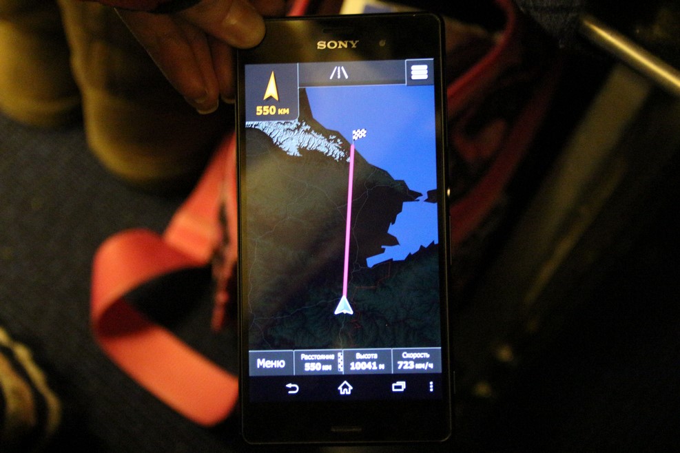 Сели в самолет. Рядом с нами сидел дяденька, который подал интересную идею. Он на своем айпаде включил навигатор и пытался смотреть текущее состояние полета. После начала набора скорости самолетом айпад сошел с ума, потерял спутники и больше уже их не находил. Мой же Sony Xperia Z3 отлично ловил спутники весь полет, информируя нас о высоте полета, скорости и оставшемся расстоянии: