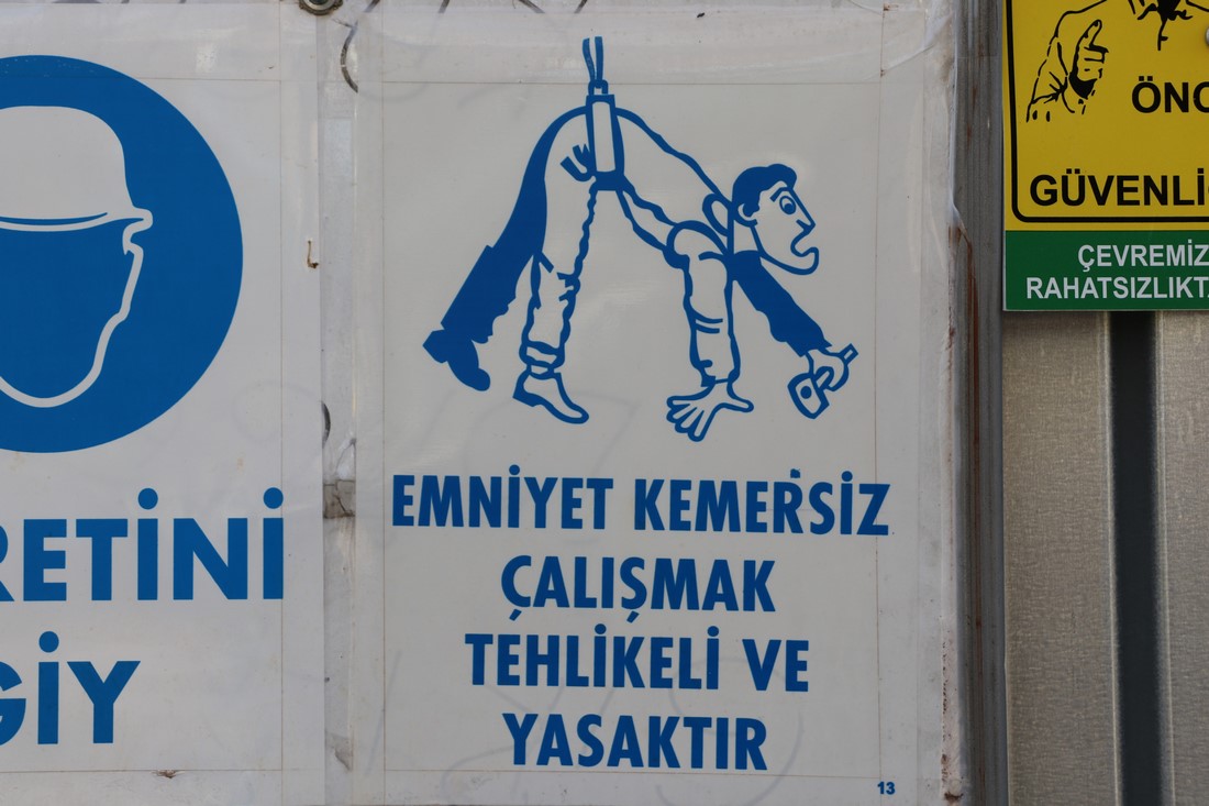 Предупреждение для строителей на строительной площадке о том, что без страховочного ремня работать опасно: