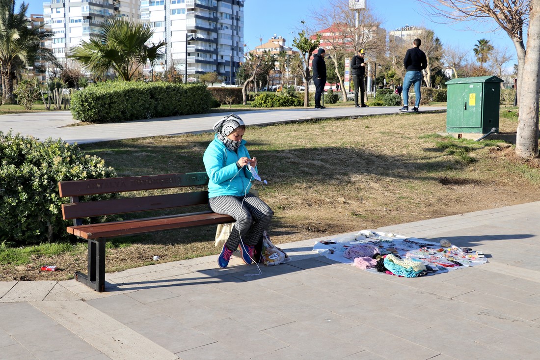 По дороге к водопаду женщина продает вязаные вещи без отрыва от производства: