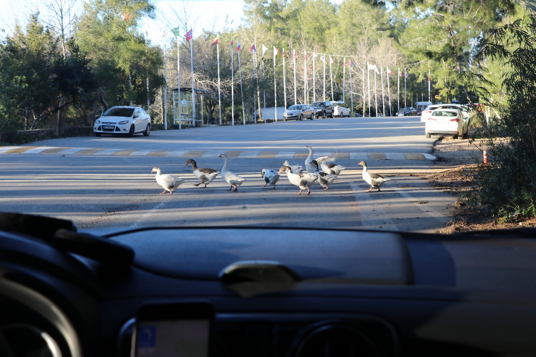 Рукотворные достопримечательности посмотрели, теперь хочется глянуть на что-нибудь природное. Едем на водопады Куршунлу. По дороге пропускаем гусей: