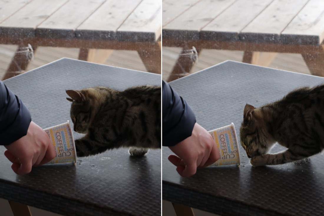 После водных процедур кормим кота кукурузой из стакана. Он ловко цеплял лапой зерна и засовывал их себе в рот: