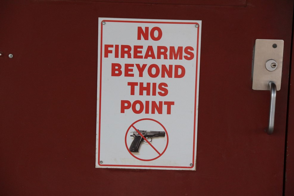 На некоторых дверях висит предупреждение, что с оружием сюда вход воспрещен: